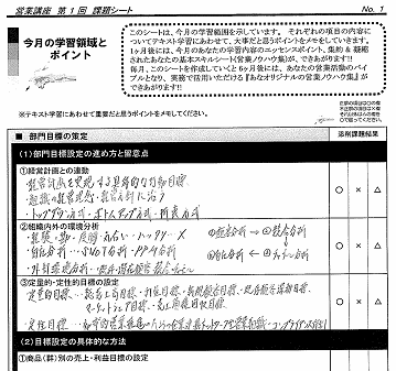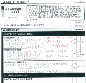 C課題シートで 添削課題で誤 った部分のチェ ック。そして再 学習によるフォ ロー活動により 基本的な営業 スキル体系を 漏れなく習得で きます。 |